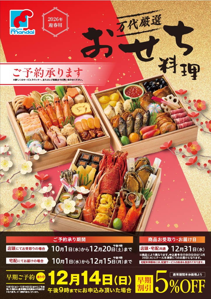 万代オリジナルのおせちをはじめ、人気料亭やホテルのおせち、ワンちゃん・ネコちゃんのおせち、オードブルおせちなど、種類も豊富にご用意しております。
